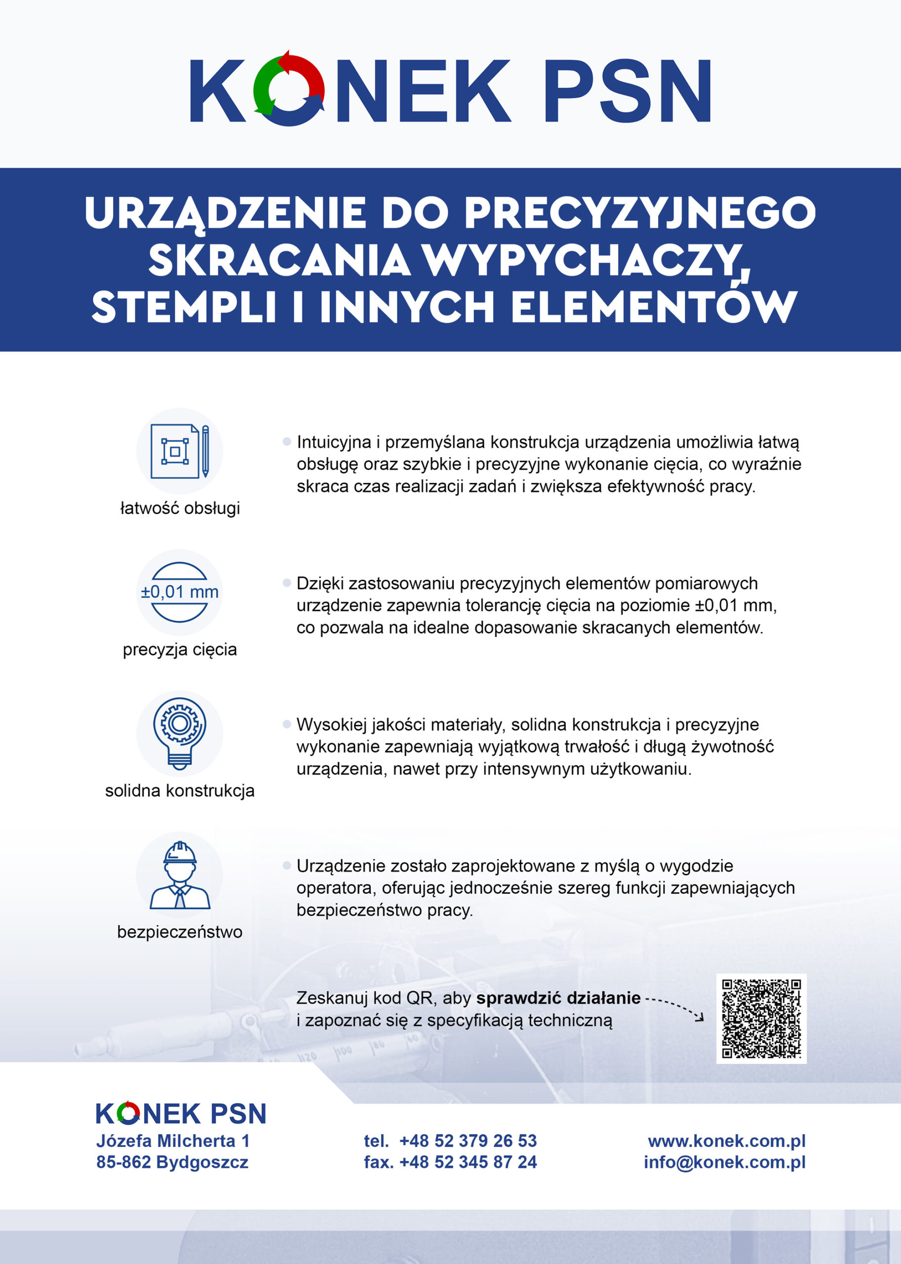 Firma KONEK PSN wprowadza na rynek urządzenie przeznaczone do precyzyjnego skracania wypychaczy, stempli oraz innych elementów wymagających dokładnego dopasowania wymiarowego.