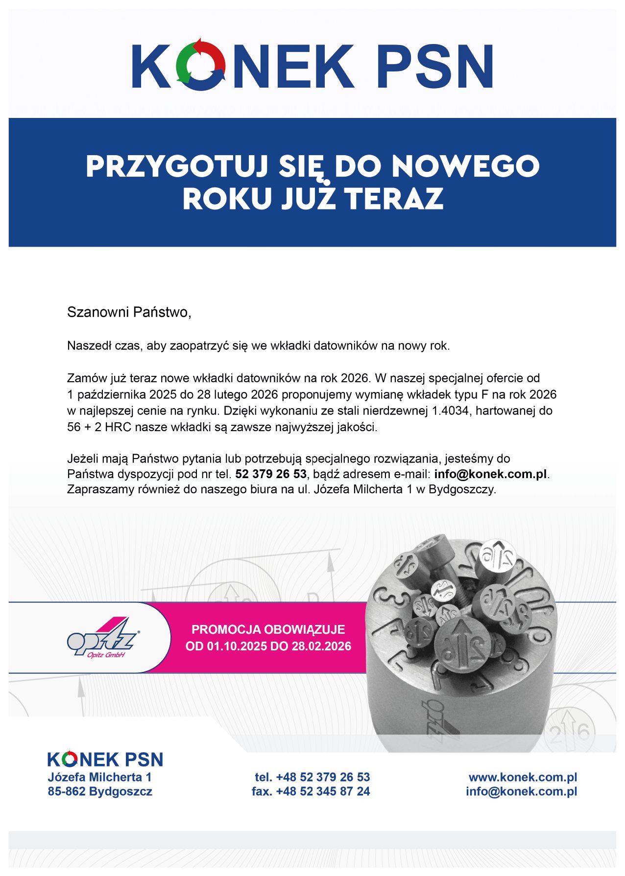 Nadszedł czas, aby zaopatrzyć się we wkładki datowników na nowy rok. Zamów już teraz nowe wkładki datowników na rok 2026. W naszej specjalnej ofercie od 1 października 2025 do 28 lutego 2026 proponujemy wymianę wkładek typu F na rok 2026 w najlepszej cenie na rynku.