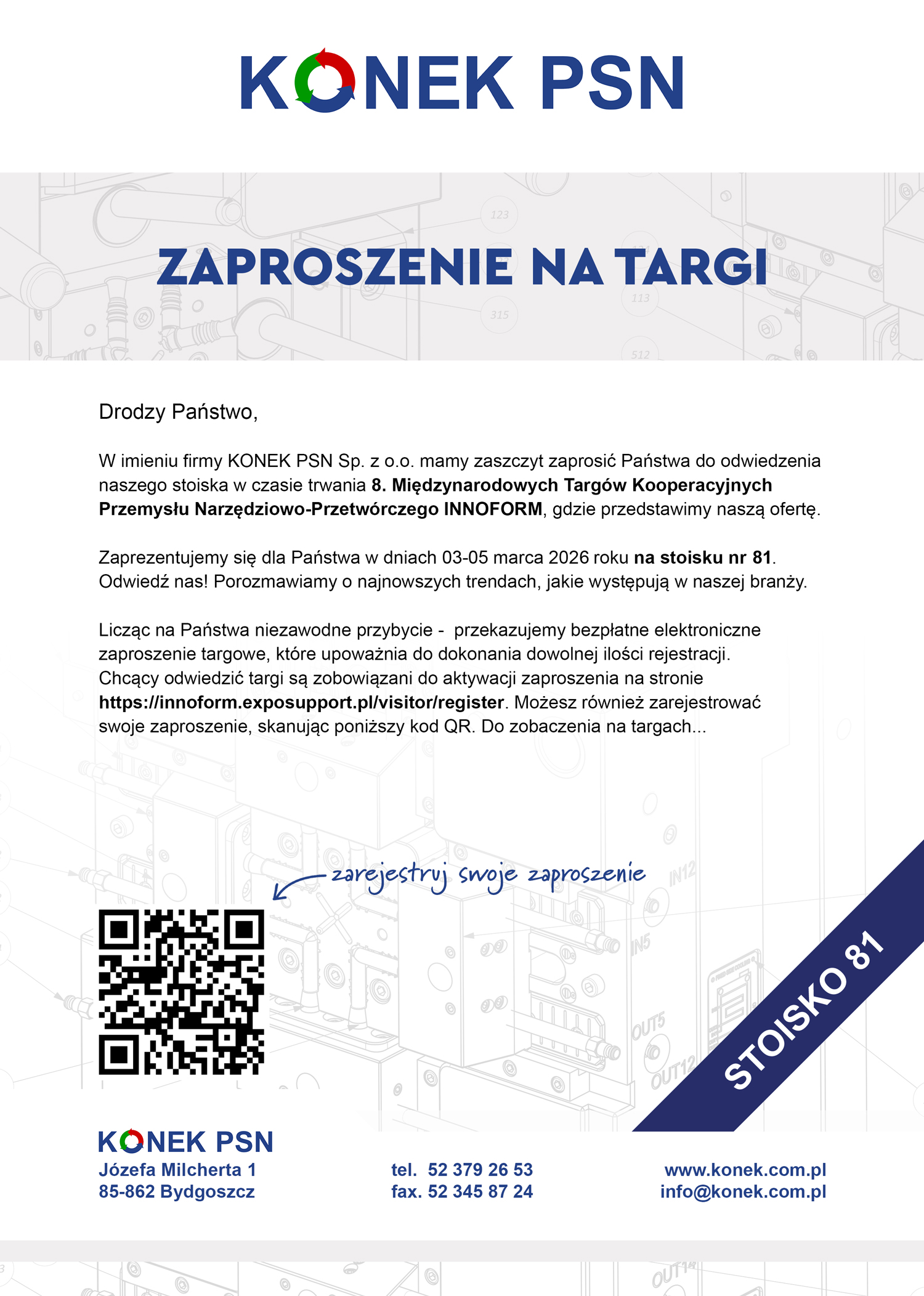 W imieniu firmy KONEK PSN Sp. z o.o. mamy zaszczyt zaprosić Państwa do odwiedzenia naszego stoiska w trakcie trwania tegorocznych targów Innoform, gdzie przedstawimy naszą ofertę. Zaprezentujemy się dla Państwa w dniach 03-05 marca 2026 roku na stoisku nr 81. Serdecznie zapraszamy.